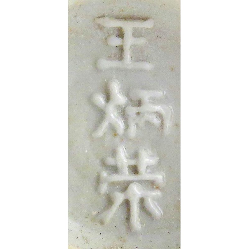 Decorated in high relief with a ewe and her lamb beneath a prunus branch, the base with three characters which read Wang Bing Rong, 7.2cm.