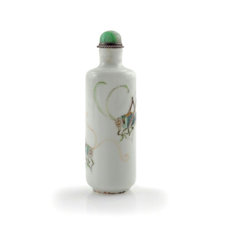 A CHINESE PORCELAIN SNUFF BOTTLE C.1900 The cylindrical body painted with two crickets