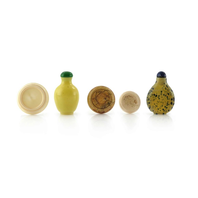 One of plain ovoid form, the other with a compressed circular body decorated with blue splashes, and three ivory snuff trays, 5cm. (5)