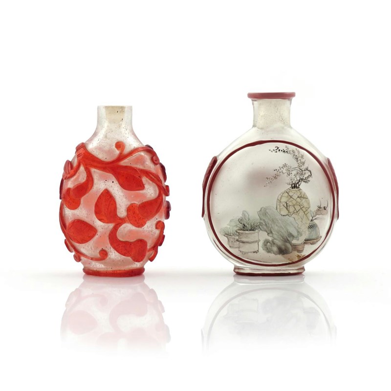 One decorated in overlaid red glass with gourds, the other interior-painted with a horse to one side, with vases and jardinières to the other, 7.3cm. (2)
