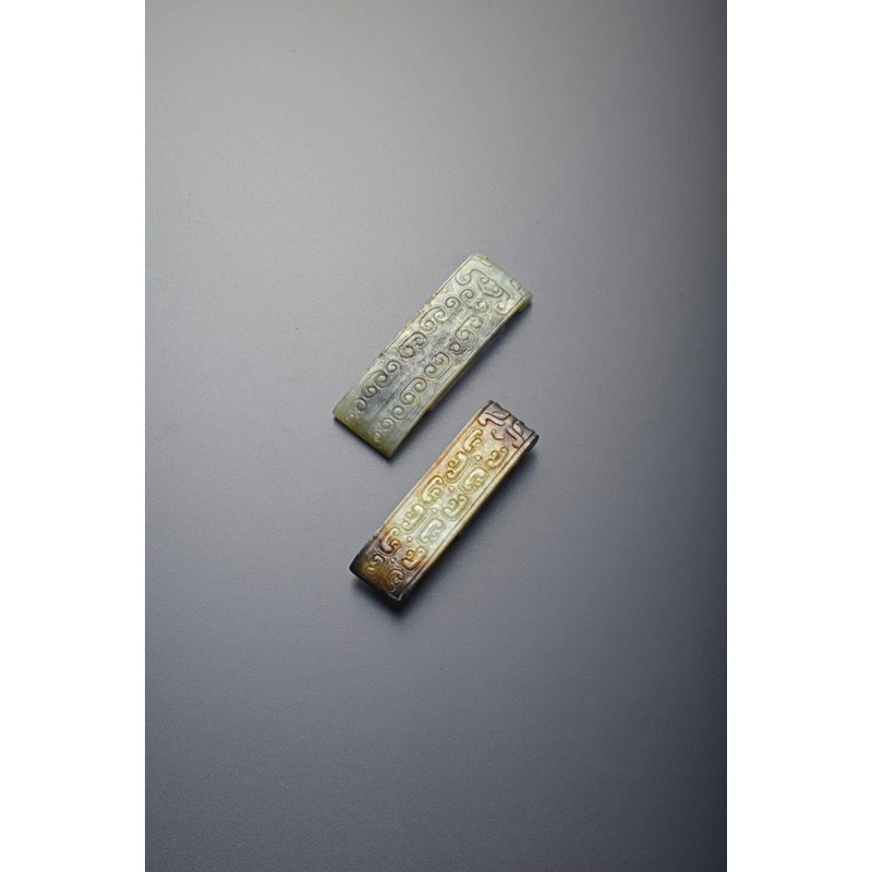 TWO CHINESE CELADON JADE SCABBARD SLIDES HAN DYNASTY 206BC - 220AD Each of rectangular form