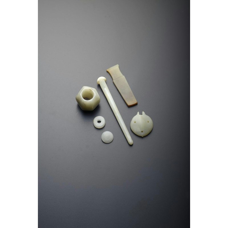 Comprising: a hairpin, a tapering hair ornament, a hexagonal finial, a peach-shaped plaque, a small disc and a button, the stones in white and celadon, 12cm max. (6)