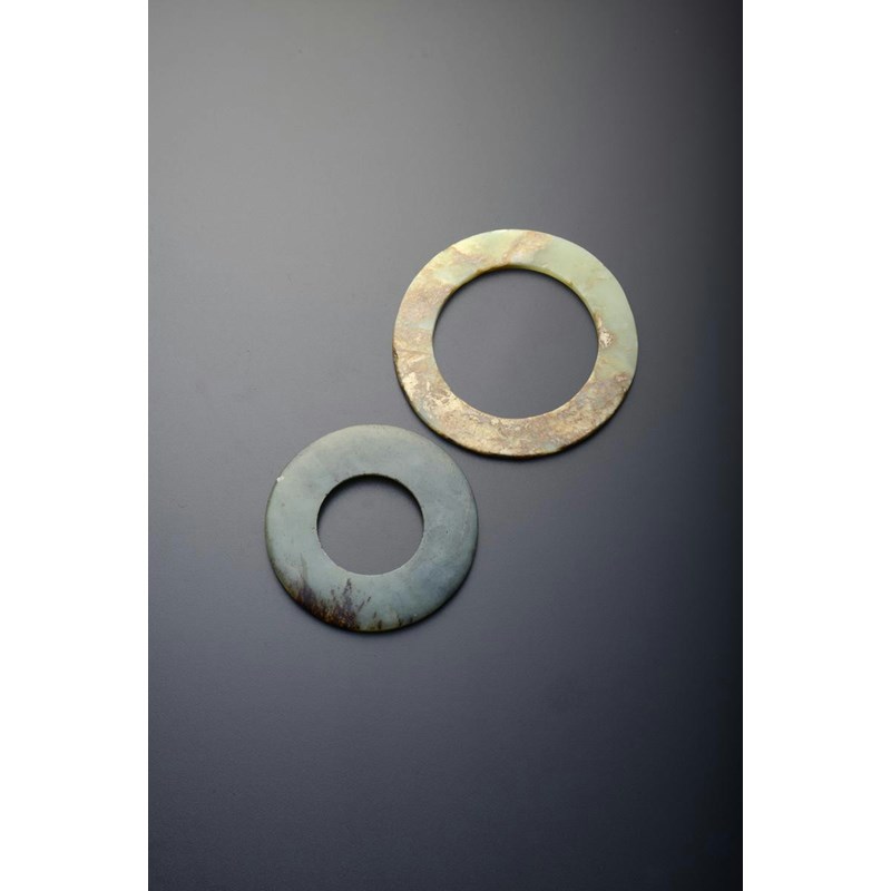 TWO CHINESE JADE BI DISCS SHANG/WESTERN ZHOU DYNASTY Both of plain circular form