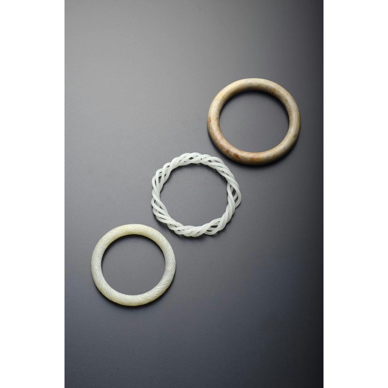 One carved with four delicate articulated intertwined continuous strands, the stone an even white tone, another of plain solid form, a third carved with a tightly twisted rope design, 8.5cm. (3)