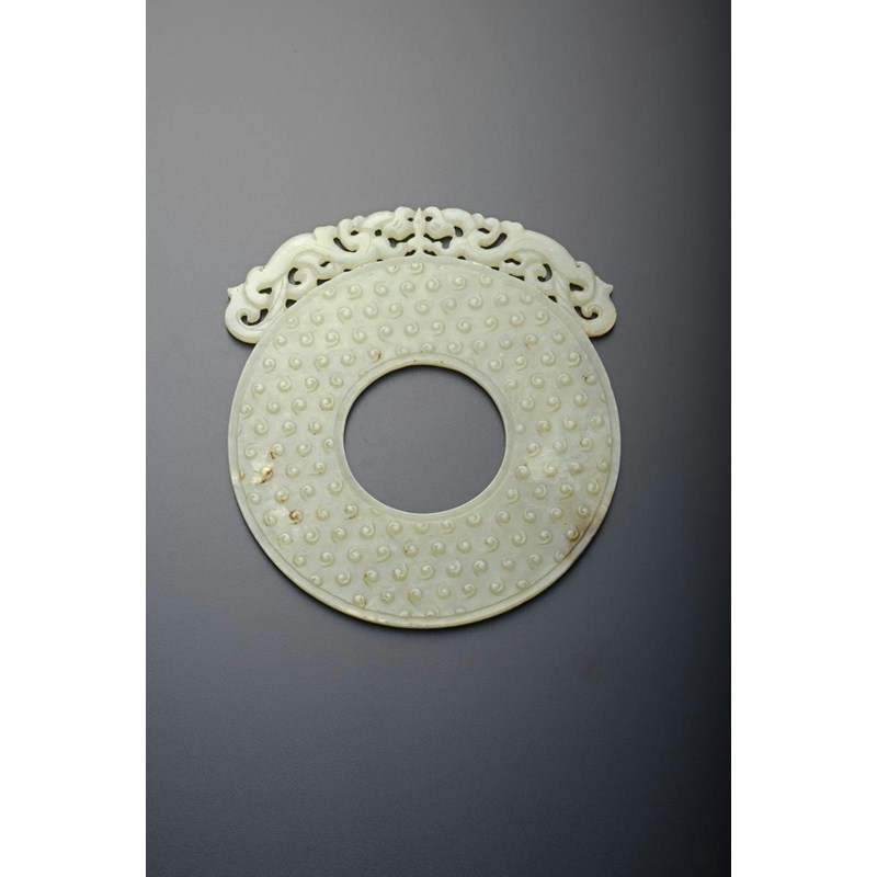 Carved in relief to each side with a spiral design within concentric bands, surmounted by two sinuous confronting chilongs separated by a floret, 17.7cm.