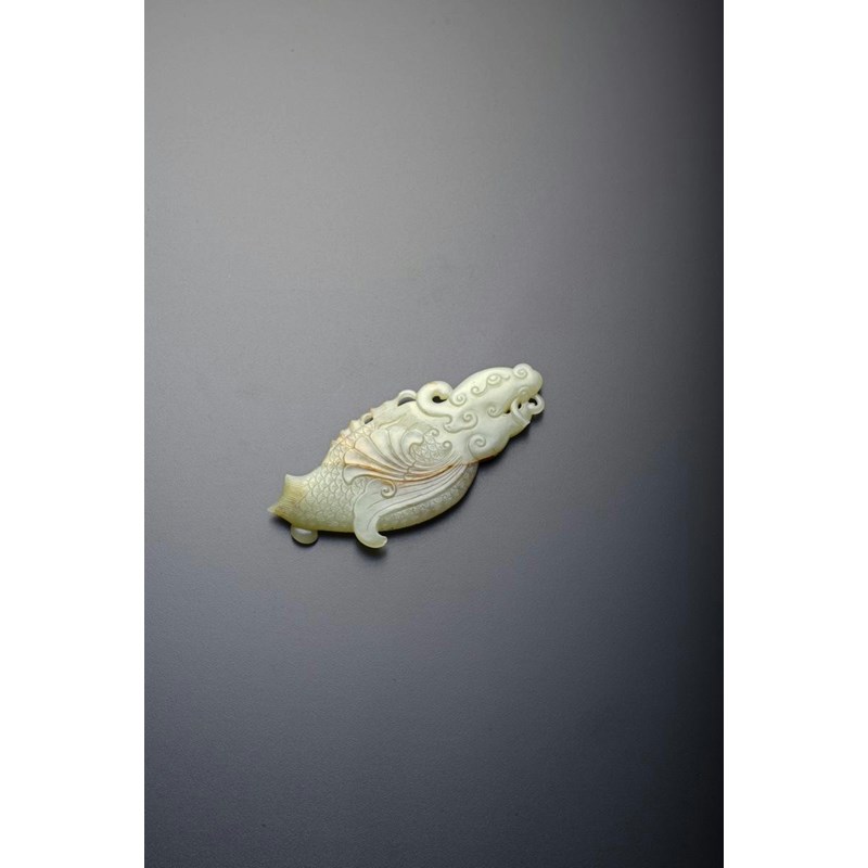 A CHINESE CELADON JADE CARVING OF A DRAGON FISH