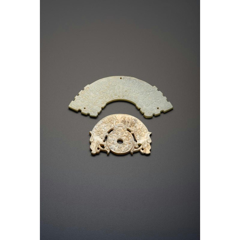 Each carved in relief with C-scrolls, one of arched form with rectangular flanges, the other a bi disc surmounted by opposing dragons and a central taotie mask, the stones in calcified celadon and white tones, 13.5cm. (2)