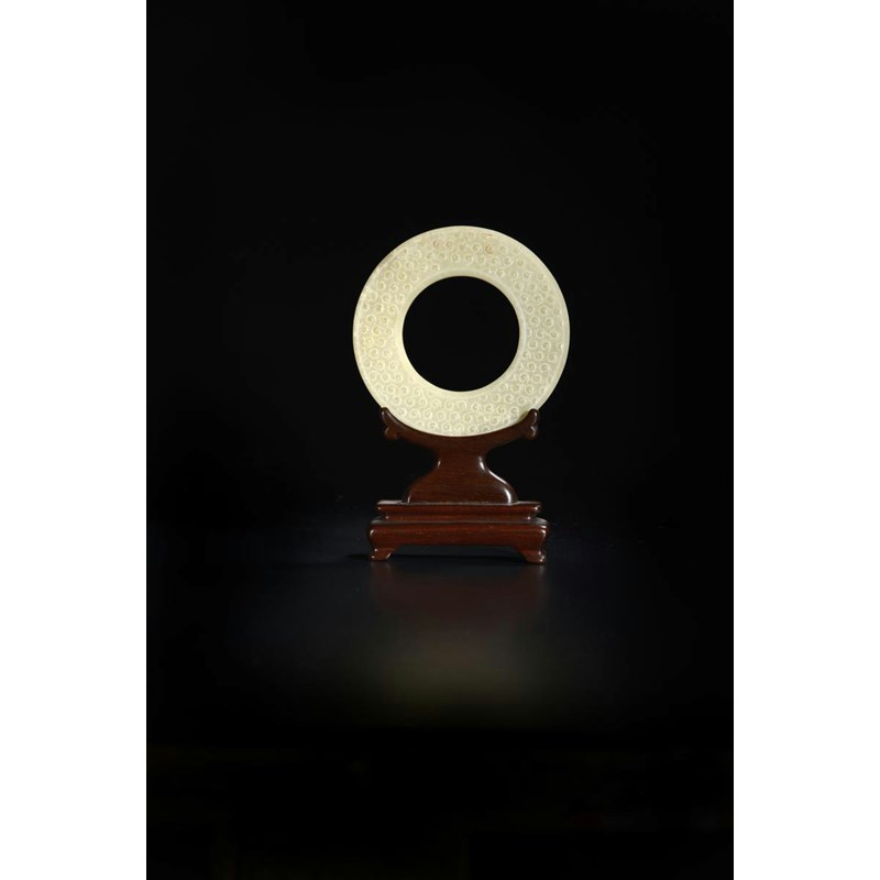 A CHINESE PALE CELADON JADE BI DISC PROBABLY WARRING STATES PERIOD Carved to each side in...