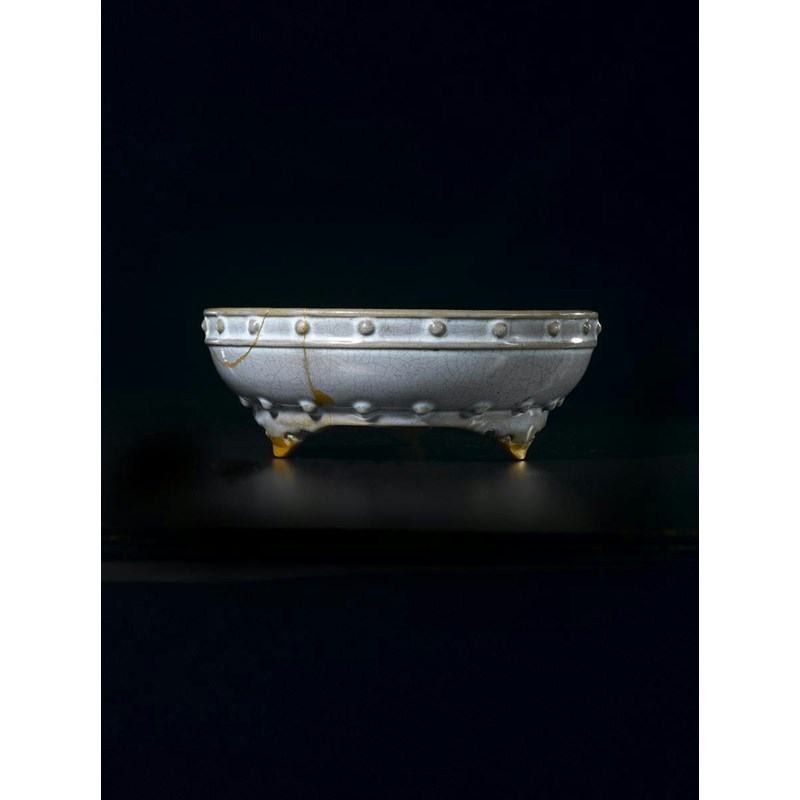 The body heavily potted, moulded to the exterior beneath the lipped rim with a band containing twenty one raised 'nail head' studs, with another row to the base above three short ruyi-shaped feet, decorated with a finely mottled pale blue and greyish-purple glaze, the base incised er, two, 25cm.