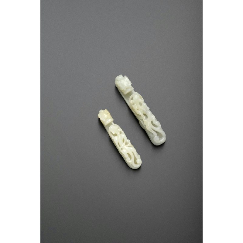 TWO LARGE CHINESE PALE CELADON JADE BELTHOOKS QING DYNASTY With dragon's head terminals and...