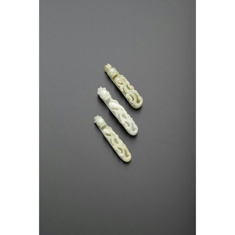 THREE CHINESE PALE CELADON JADE BELTHOOKS QING DYNASTY All carved with dragon's head terminals...
