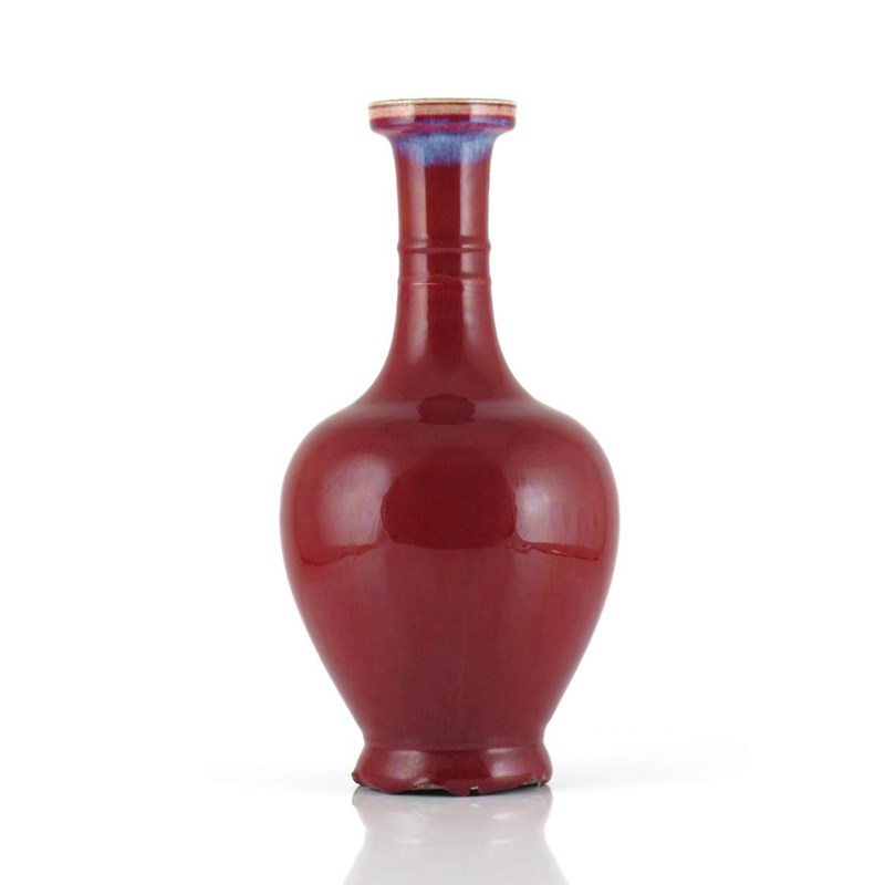 The ovoid body raised on a flared foot, the cylindrical neck with two concentric raised bands, decorated with a deep red glaze draining from the rim, 38.5cm.
