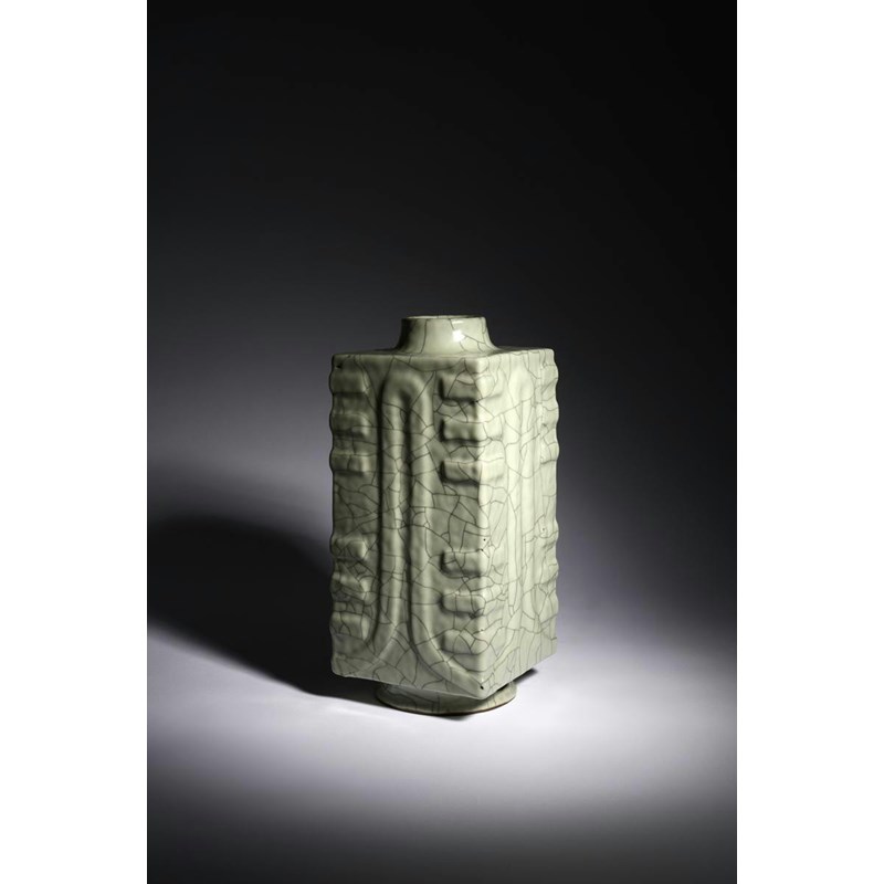 The archaistic body moulded in shallow relief with trigrams to the corners, beneath a thick pale grey glaze with dark grey crackles throughout, one side pierced with two pairs of small circular holes, possibly for suspension, the splayed foot with two slotted apertures, 29cm.