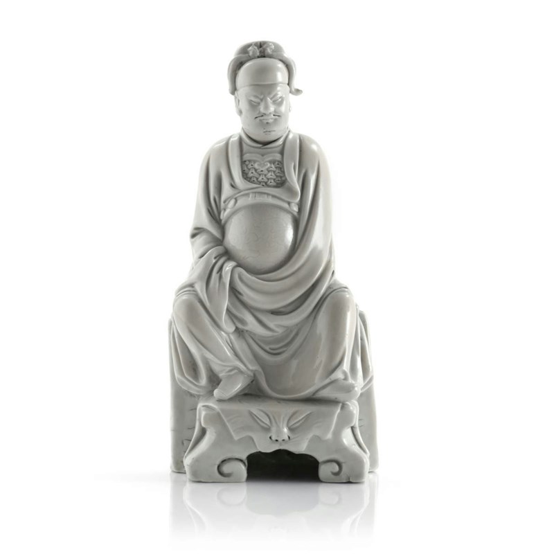 A CHINESE BLANC DE CHINE FIGURE OF GUANDI 17TH CENTURY Seated on a tiger skin with his hands...