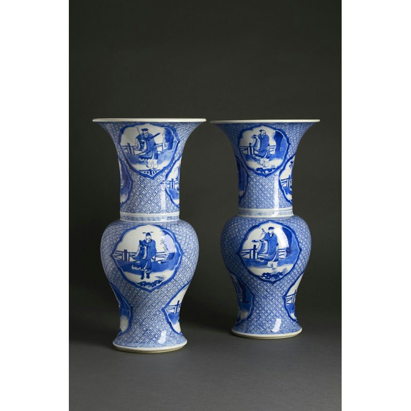 A PAIR OF CHINESE BLUE AND WHITE YEN YEN VASES KANGXI 1662-1722 Painted with shaped panels...