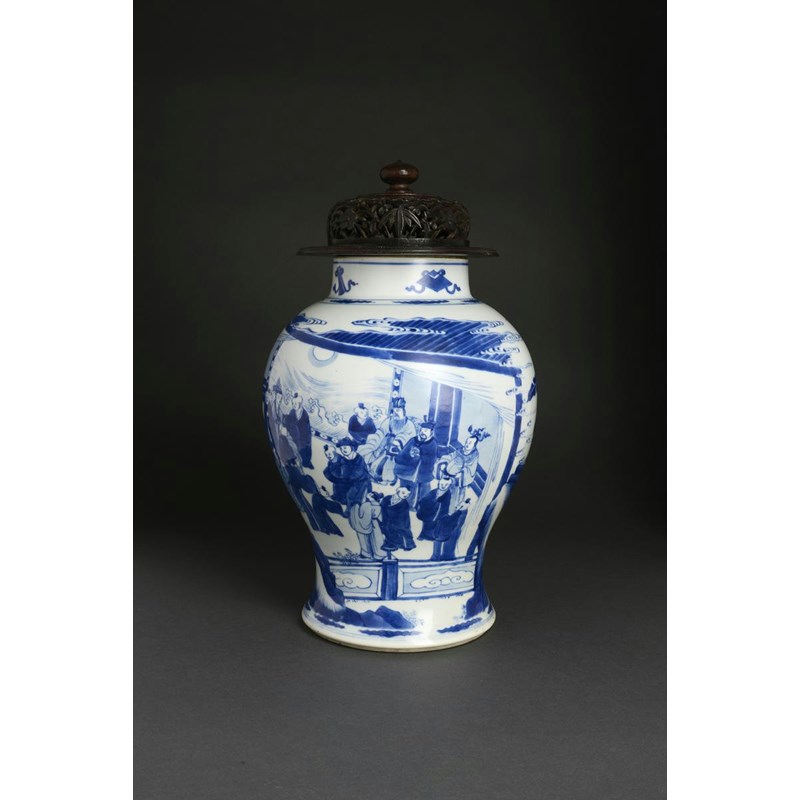 A CHINESE BLUE AND WHITE BALUSTER VASE KANGXI 1662-1722 Painted with many figures beneath a...