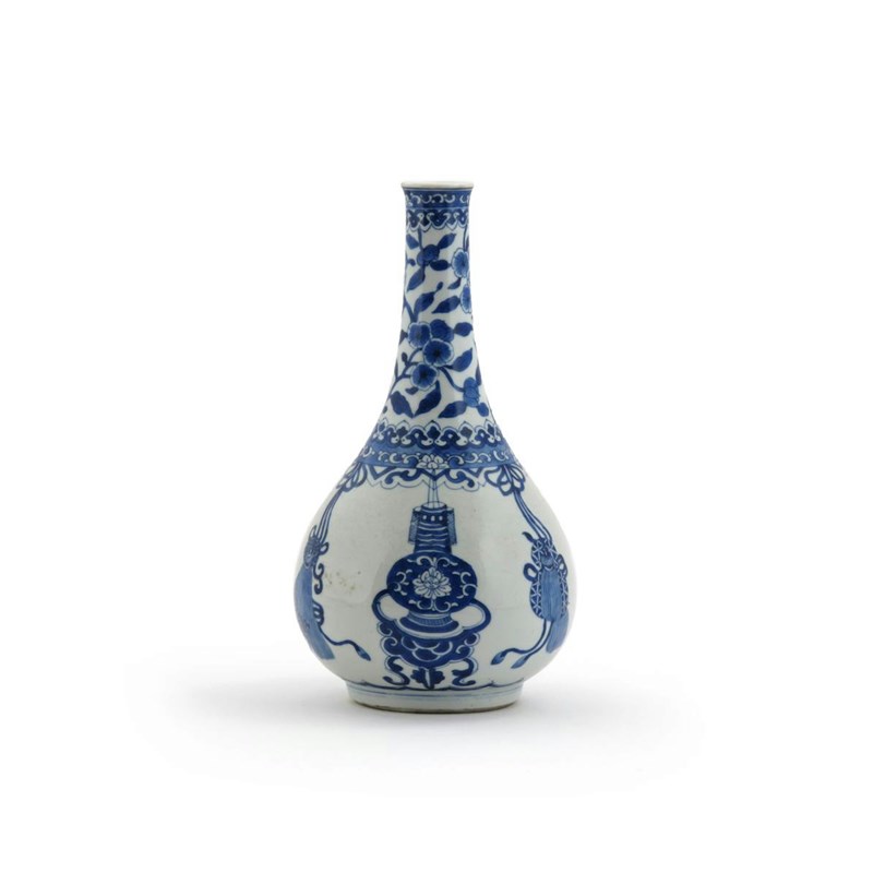 A CHINESE BLUE AND WHITE BOTTLE VASE KANGXI 1662-1722 The globular body painted with vases and...
