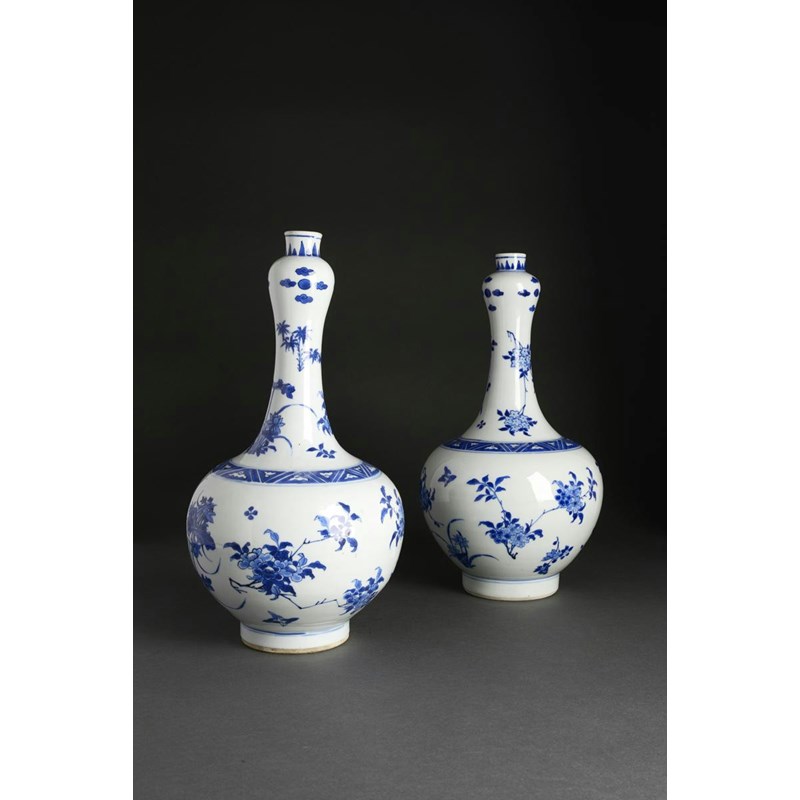 A PAIR OF CHINESE BLUE AND WHITE BOTTLE VASES C.1640 Each ovoid body rising to a garlic-mouthed...