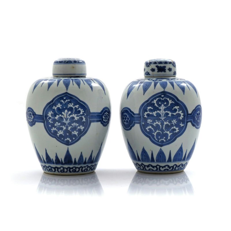 A PAIR OF CHINESE BLUE AND WHITE OVOID VASES AND COVERS KANGXI 1662-1722 Each with three panels...