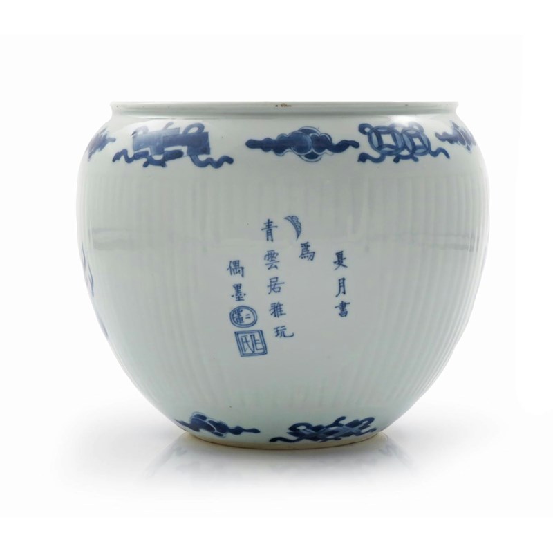 Decorated to the exterior with four roundels, one containing a fish, one a dragon, another a kylin, the fourth an inscription which reads xia yue gong wei qing yun ju ya wan, ou mo, all within bands of clouds and auspicious things, the base with a six character Jiajing mark, 22cm dia.