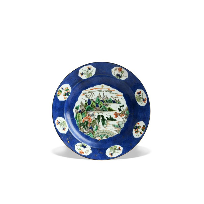 Painted with a central barbed panel depicting an extensive mountainous landscape, with pagodas, trees and a bridge to the foreground, the rim with smaller panels containing flower sprays, all reserved on a powder-blue ground with gilt panels and foliate designs, the base with a lozenge mark, 40.7cm.