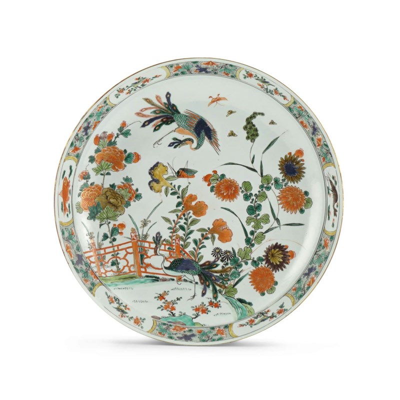 A LARGE CHINESE FAMILLE VERTE DISH KANGXI 1662-1722 Painted with a peacock in a fenced garden