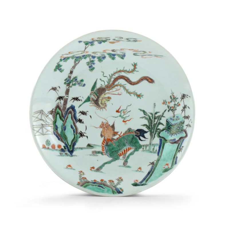 A LARGE CHINESE FAMILLE VERTE DISH KANGXI 1662-1722 Painted with a phoenix in flight above a...