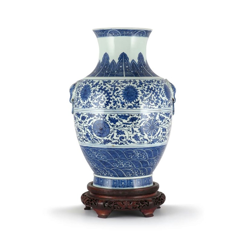 The ovoid body painted with concentric bands depicting crashing waves, scrolling lotus designs and stylized acanthus leaves, with elephant head handles, the base with a six character Qianlong seal mark, raised on a reticulated hardwood five-legged stand carved with lotus, 60.5cm. (2)