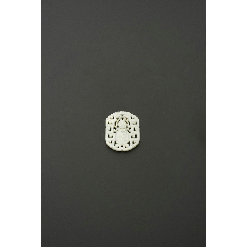 Reticulated and carved with a smaller plaque to the interior, with a long feng mark to one side, a phoenix to the other, encircled by two stylized dragons, 5.5cm.
