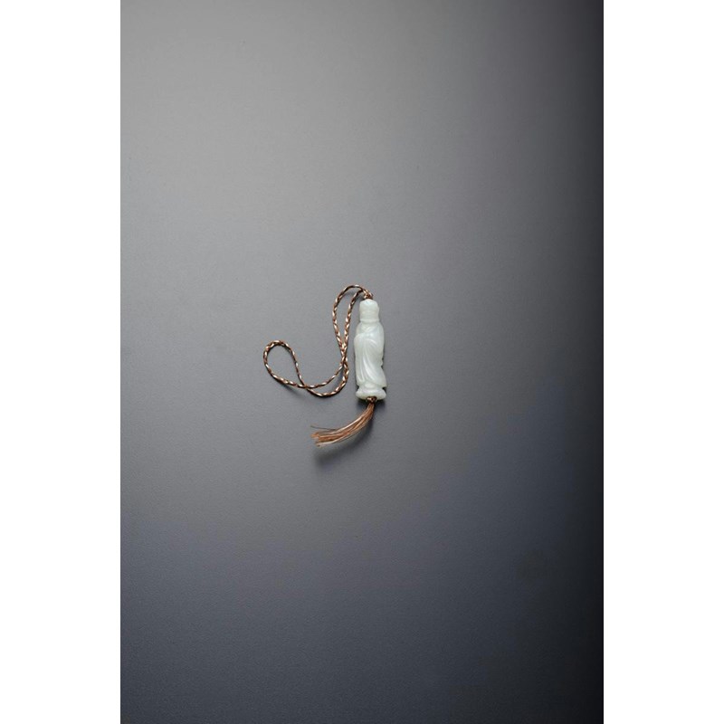Standing, his long robes held about him, his head slightly down-turned, the carving pierced and suspended from a cord, 5cm.