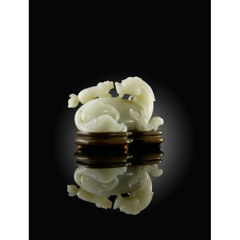 A CHINESE PALE CELADON JADE MODEL OF A KYLIN QIANLONG 1736-95 Crisply carved in a recumbent position