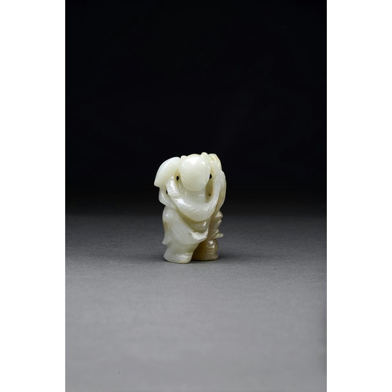 A CHINESE CELADON JADE CARVING OF A BOY MING/QING DYNASTY Standing with his foot raised