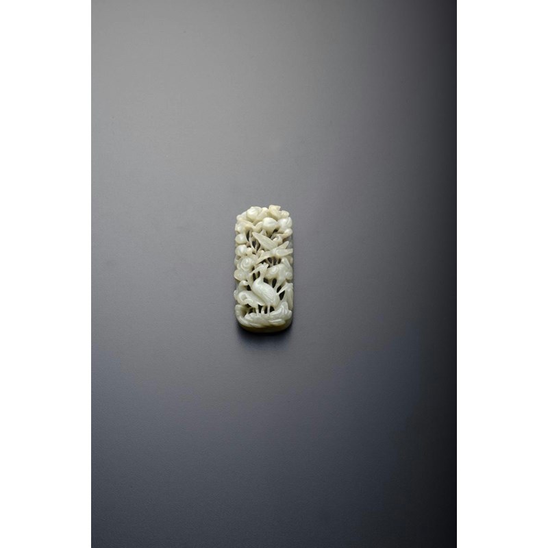 A CHINESE CELADON JADE RETICULATED PLAQUE YUAN DYNASTY 1271-1368 Carved in high relief with two...