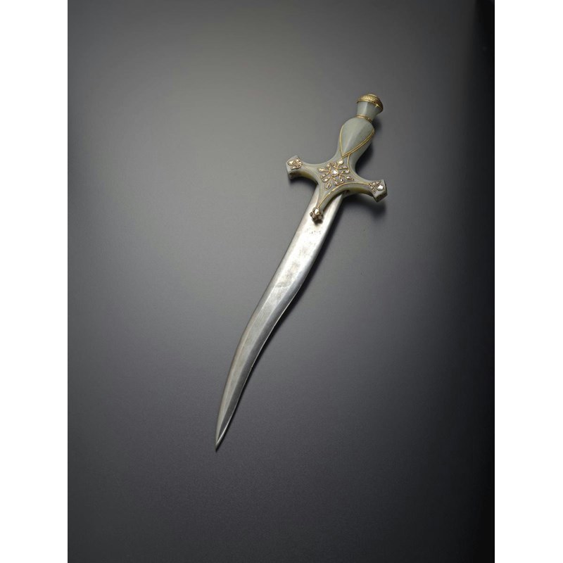 A MOGHUL CELADON JADE-MOUNTED DAGGER 19TH CENTURY The cruciform hilt inset to each side with...