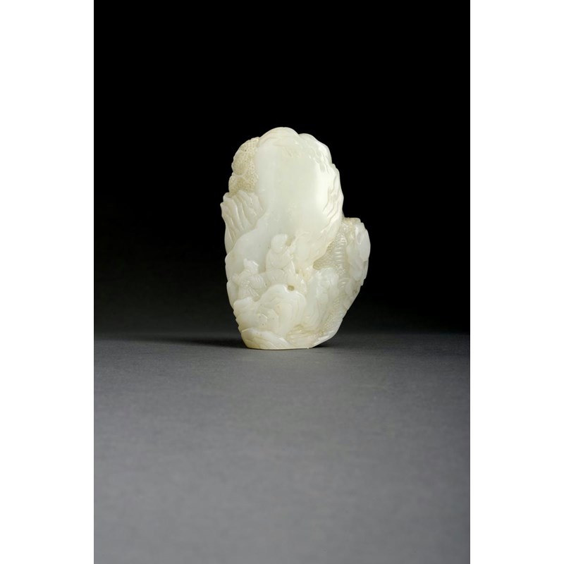 A CHINESE PALE CELADON JADE SMALL BOULDER CARVING QING DYNASTY Depicting two figures