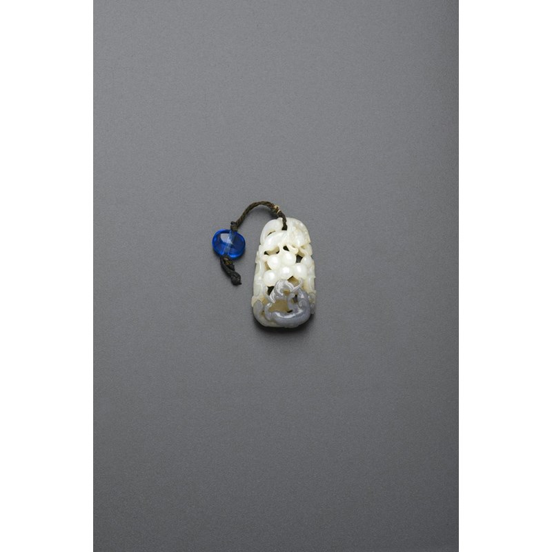 A CHINESE WHITE AND GREY JADE PENDANT QING DYNASTY Delicately carved with a fruiting grape vine