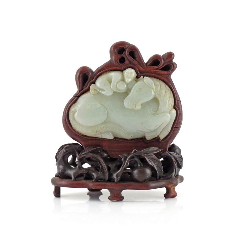 Carved as a recumbent horse, with a monkey holding two peaches and clambering upon the horse's back, mounted in a wood panel, and with a reticulated wood stand, 15.5cm overall. (2)