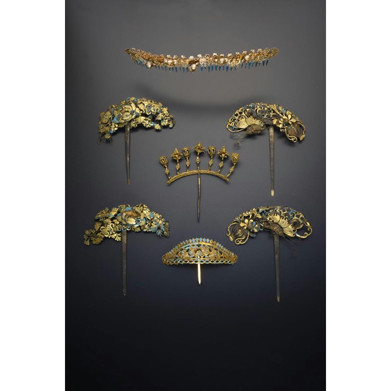 SIX LARGE CHINESE GILT METAL AND KINGFISHER FEATHER HAIRPINS QING DYNASTY Each formed with...