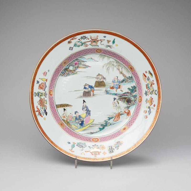 Cf. Ausstellung Chinesischer Kunst, no.1036 for a related Yongzheng famille rose dish with fishermen and a lady breast-feeding her baby, see also Bonhams London, 18th May 2023, lot 159 for another example.