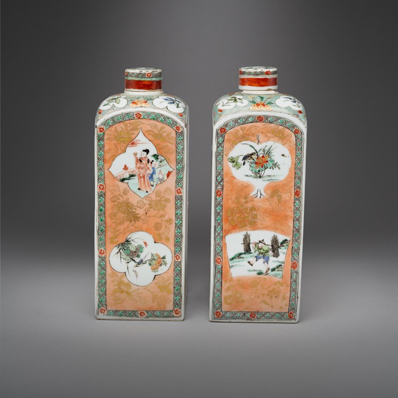A PAIR OF CHINESE FAMILLE VERTE SQUARE-SECTION FLASKS AND COVERS