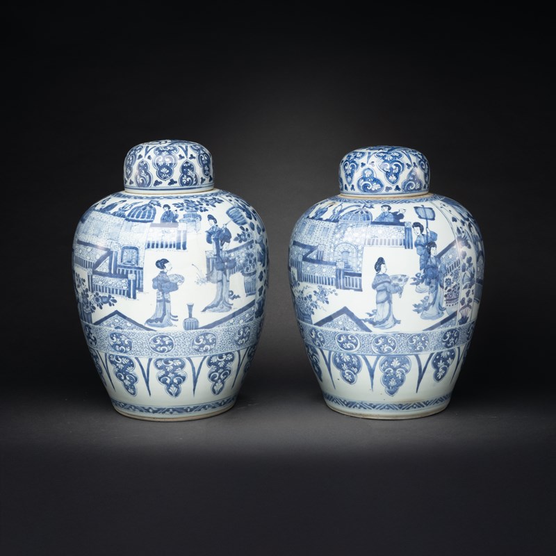 A PAIR OF FINE CHINESE BLUE AND WHITE 'LADIES' JARS AND COVERS