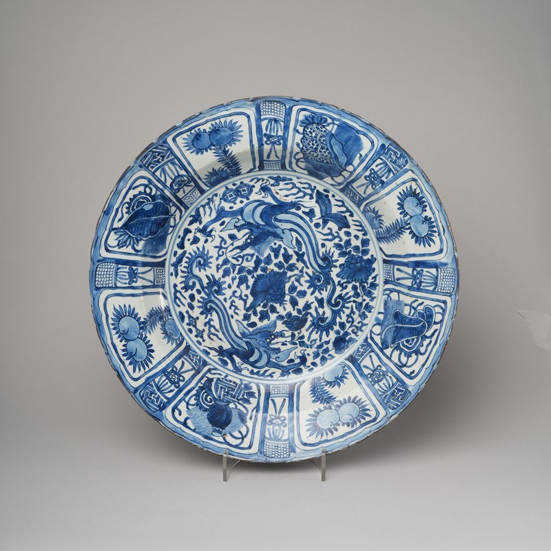 A LARGE AND RARE CHINESE BLUE AND WHITE KRAAK 'WINGED DRAGON' DISH