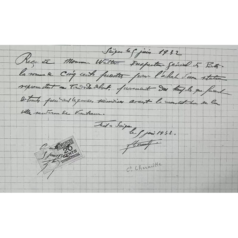 Provenance: with a copy of an invoice written in French dated 5th June 1932 which can be translated to 'Receipt for Mr Walter, Inspector General of Posts, the sum of 500 francs for the purchase of a standing statue... which comes from the temples which were destroyed during the Vietnam wars before the reconstitution...'.
