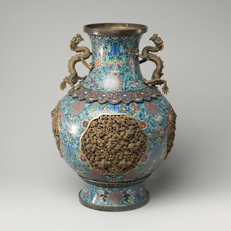 The separately cast body set with four medallions each containing a front-facing five-clawed dragon in gilt-bronze amid reticulated cloud scrolls, surrounded by cloisonné enamel lotus scrolls interspersed with bats and shou characters, the body rotating around a central core mounted on the foot with a row of stiff lappets to support the body, the flaring neck also fixed around the core with a band of interlocking ruyi-heads, flanked by two dragon handles, the rim and base with borders of key fret, the base with a De Cheng mark, 47.5cm.