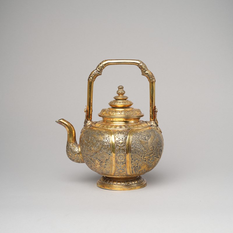 十九世紀 外銷東南亞及泰國銀鍍金開光花鳥紋提樑茶壺