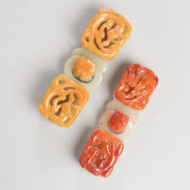 十九世紀 翠玉巧色蒼龍教子帶鉤一組兩件