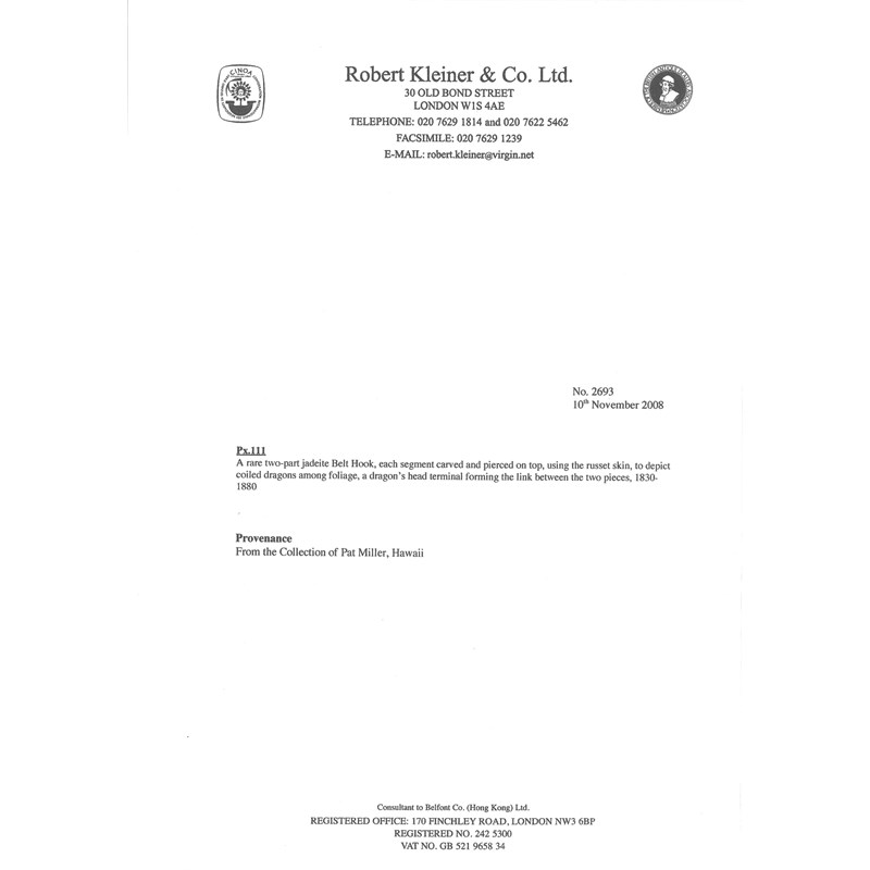來源:英國約克郡的私人收藏,分別於 2008 年 11 月 10 日和 2009 年 11 月 3 日購自倫敦Robert Kleiner ;較小的帶鉤為夏威夷的 Pat Miller 舊藏。