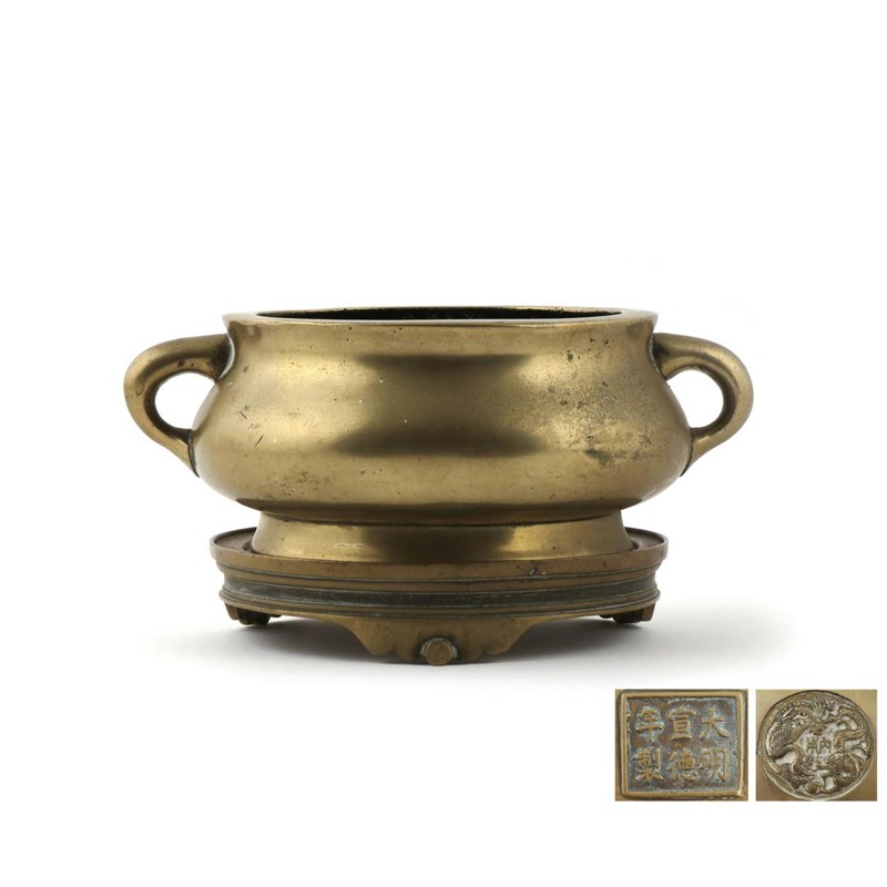 A Chinese bronze incense burner and stand 19th century, the compressed circular body with loop handles, the base cast with a dragon and phoenix encircling two characters, the stand with a six character Xuande mark, 24cm. (2)