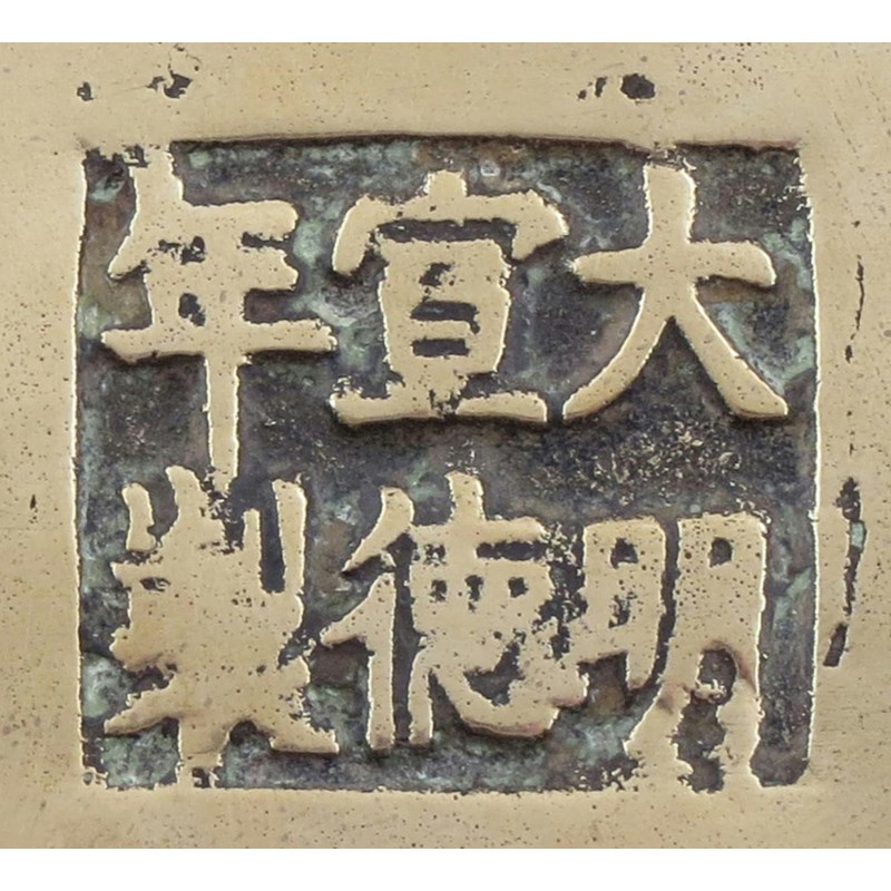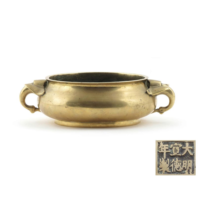 A Chinese gilt bronze incense burner 19th century, with a compressed circular body, the handles in the form of cranes, the base with a six character Xuande mark, 30cm.