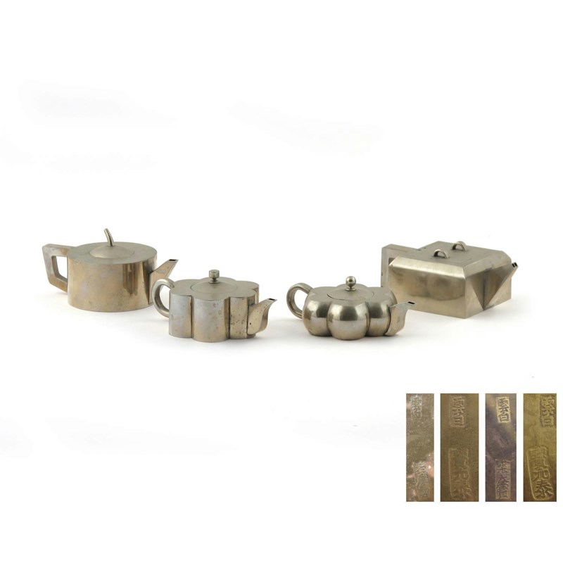 Four Chinese paktong teapots and covers 19th/20th century, two of lobed form, another cylindrical with a domed cover, the fourth square with two chambers and two rectangular covers, each with two impressed marks to the base, 15.5cm. (9)